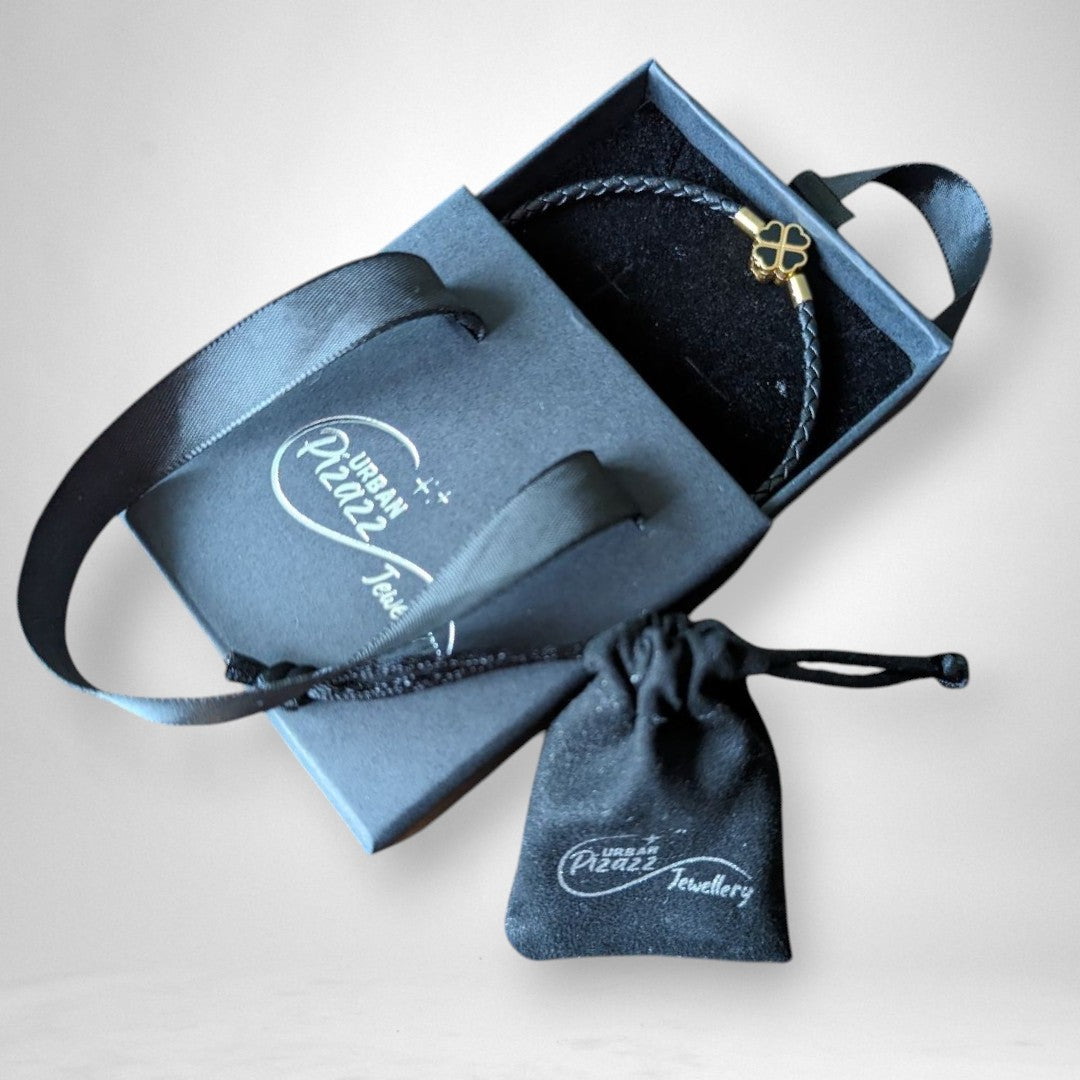 Black Leather and Gold Plated Clover Leaf Charm Bracelet. This bracelet features a cowhide woven band and a sleek stainless steel clasp, adorned with an 18ct gold plated.
