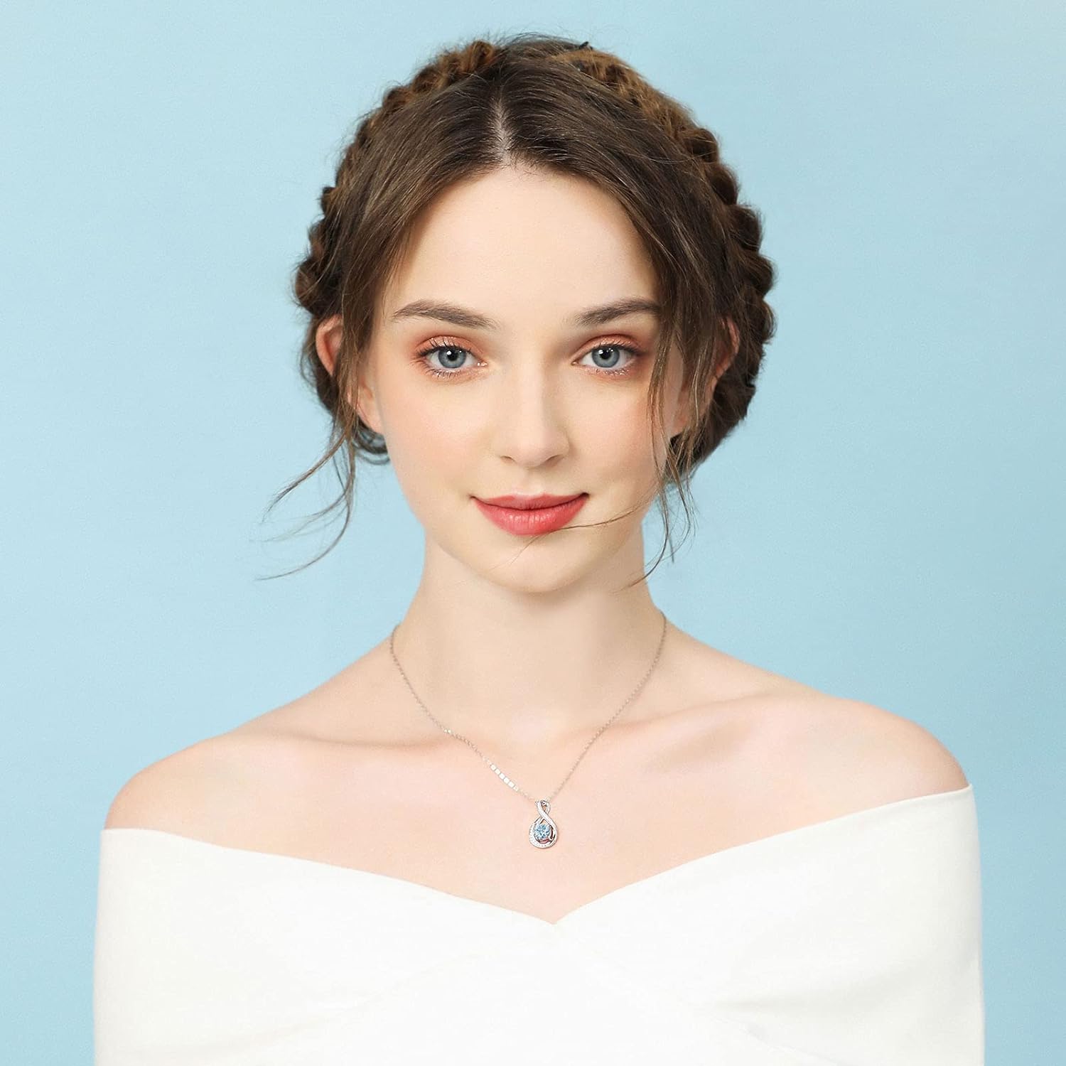 Our March Birthstone sterling Silver Infinity Pendant Necklace adorned with the March birthstone, aquamarine cubic zirconia.