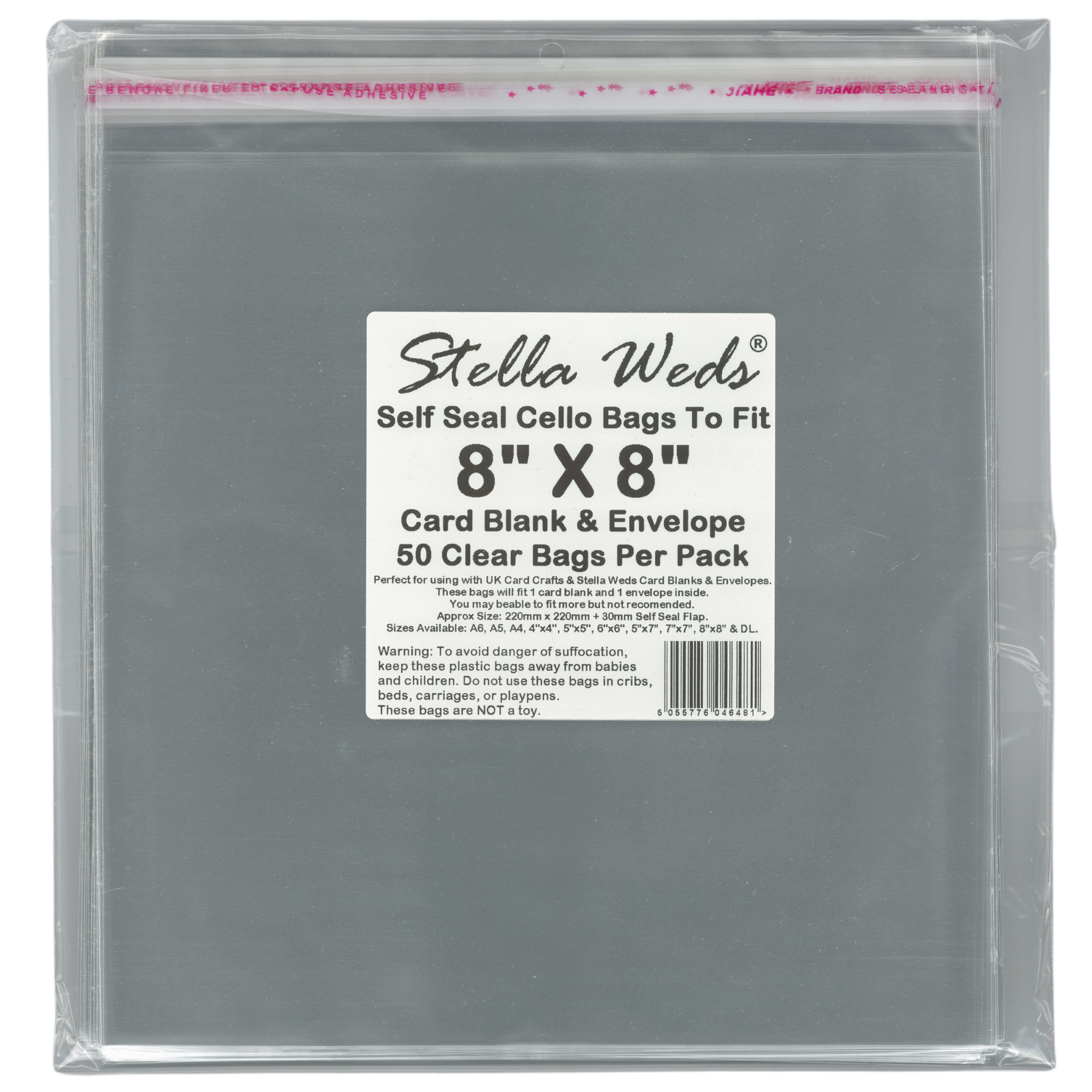 Introducing our Stella Weds 8x8 Self-Seal Cello Bags - a pack of 1000 bags designed specifically for 8x8-sized card blanks and envelopes. These crystal-clear bags measure about 220mm x 220mm and come with a 30mm self seal flap, ensuring a snug and stylish fit for your cards. Perfect for showcasing your cards in a VIP manner, these cellophane bags can also be used for packaging sweets, cookies, gifts, jewelry, and more.