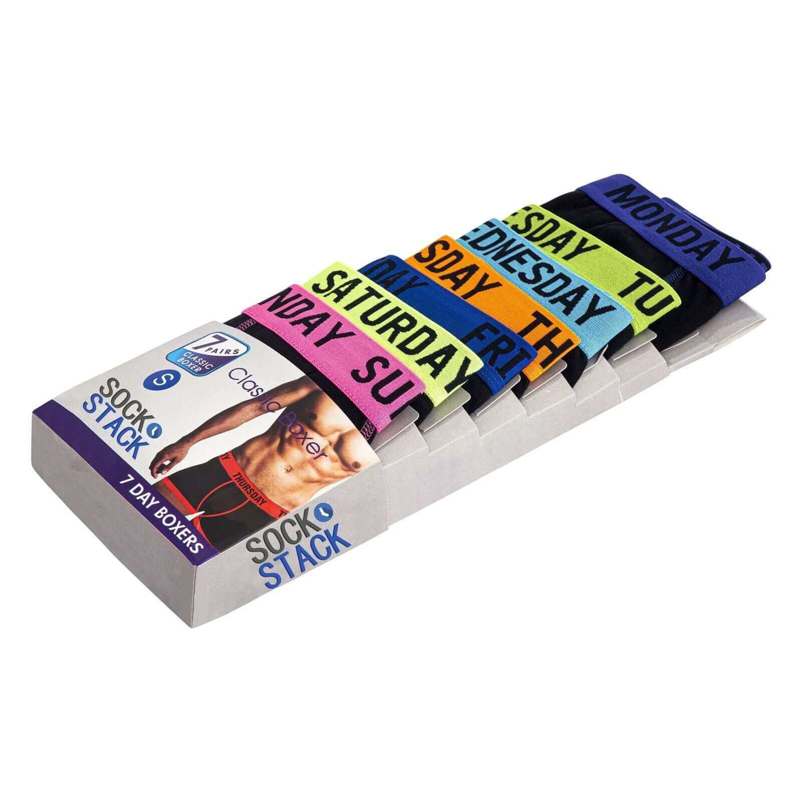 7 Pack Days Of The Week Comfort Fit Boxer Shorts Menswear Activewear Classic Breathable with Premium Cotton Blend and Colourful Assorted Waistband Stretchable Durable Everyday Wear Sizes Small to XLarge by Sock Stack