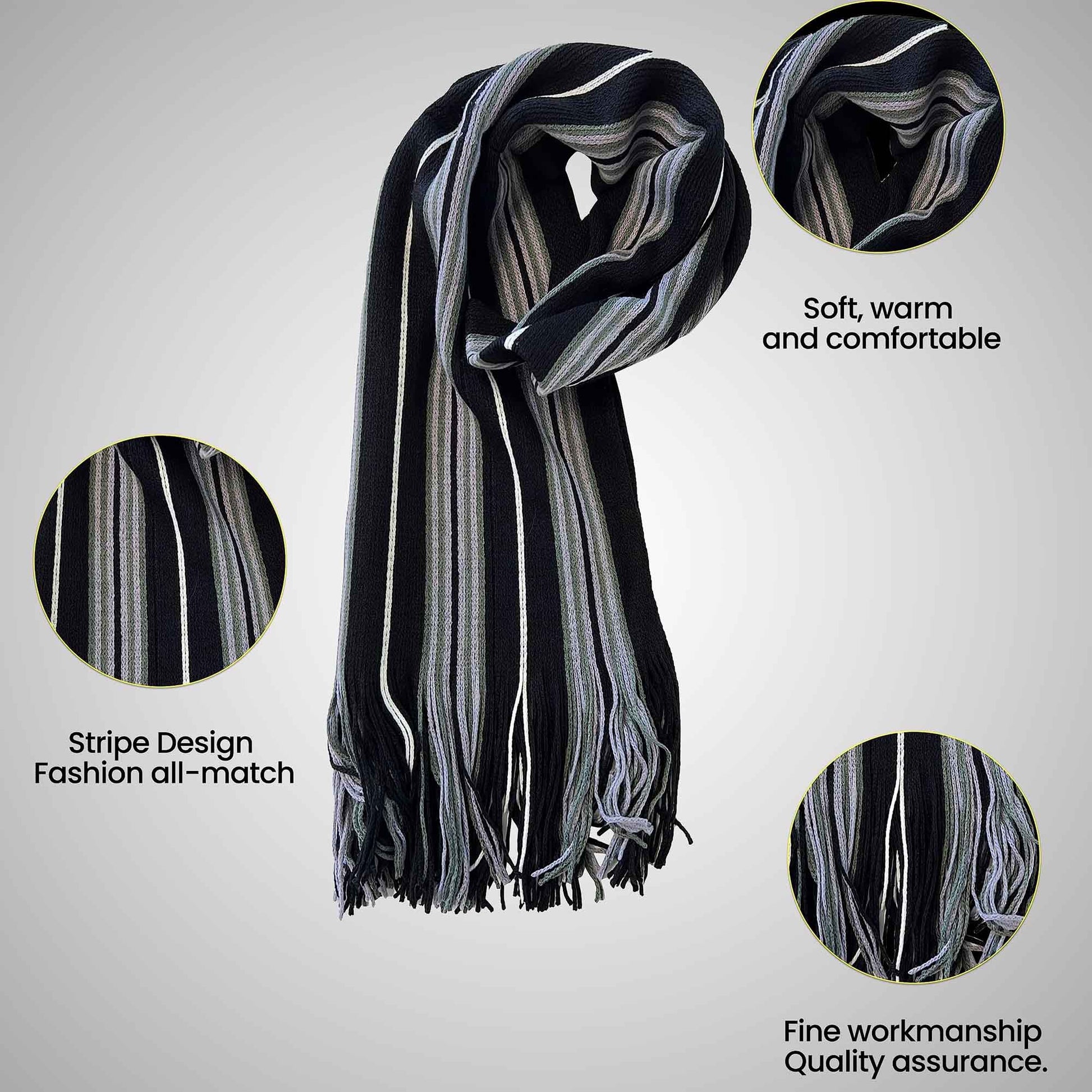 Description: The men's scarf showcases a carefully crafted design with alternating stripes, adding a touch of visual interest and modernity to your attire. The stripes are meticulously woven to create a balanced and stylish pattern.