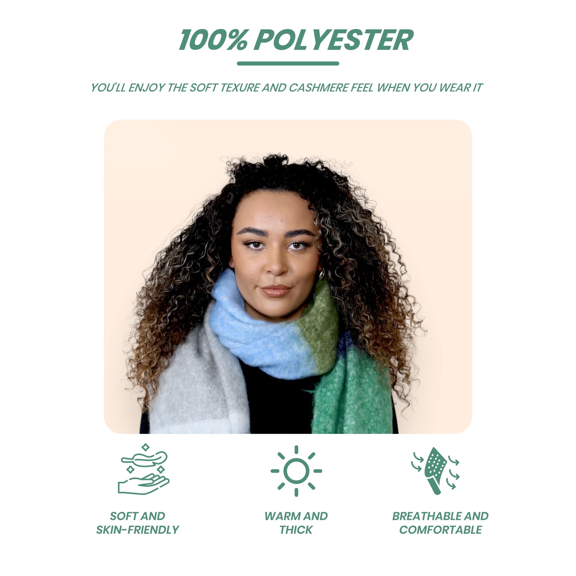 Description: Made from 100% high-quality polyester fibers, this scarf offers a soft and luxurious feel against your skin. Its durable knit construction ensures long-lasting wear, maintaining its vibrant colors and cozy texture through repeated use and washes.