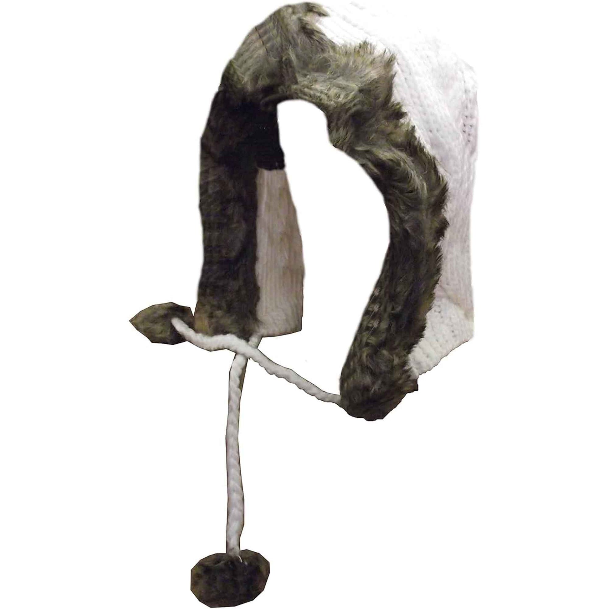 Women's Winter Chunky Knit Hood Hat with Faux Fur Trim and Pom Poms Warm Acrylic One Size Fits All in Cream Beige and Black by Sock Stack